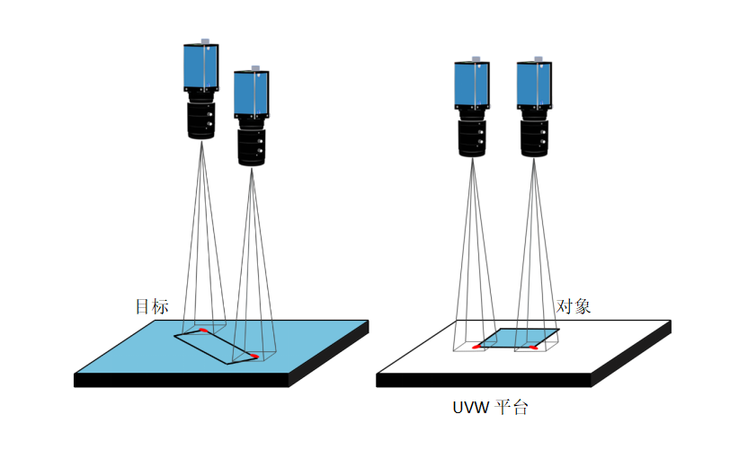 對(duì)位目標(biāo)不固定,通過非對(duì)位平臺(tái)上的目標(biāo)相機(jī)獲取坐標(biāo),通過映射關(guān)系轉(zhuǎn)換到平臺(tái)上相機(jī)中,再計(jì)算出對(duì)象和目標(biāo)位置偏差,使對(duì)準(zhǔn)目標(biāo)位置。
