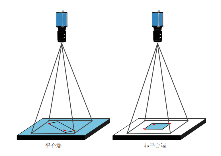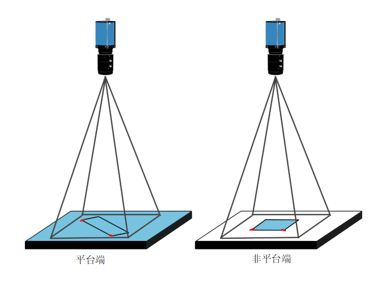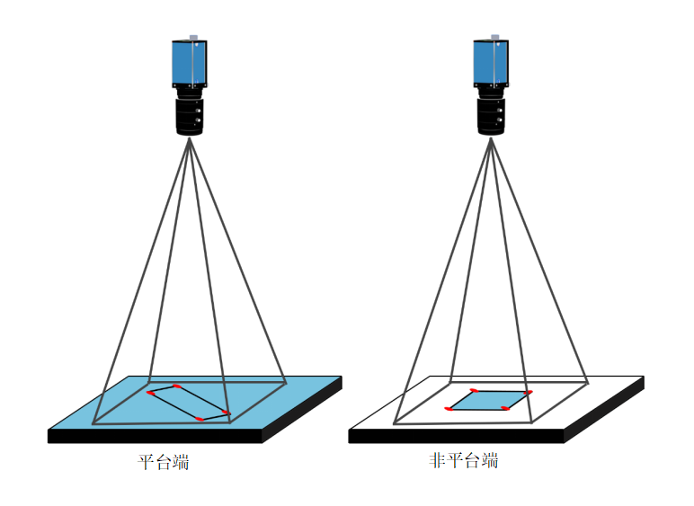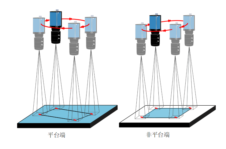 說明:平臺(tái)端和非平臺(tái)端來料位置都不固定,但Mark與產(chǎn)品的相對(duì)位置固定。四個(gè)Mark對(duì)應(yīng)矩形產(chǎn)品的四個(gè)角點(diǎn)。拍攝時(shí)確保四個(gè)Mark都在相機(jī)視野內(nèi)(通常是將產(chǎn)品抓起后再拍攝防止拍完再抓導(dǎo)致產(chǎn)品移動(dòng)或變形)。根據(jù)糾偏算法找到偏移量。根據(jù)偏移量和兩端相機(jī)的映射關(guān)系將平臺(tái)端的產(chǎn)品貼到非平臺(tái)端上。