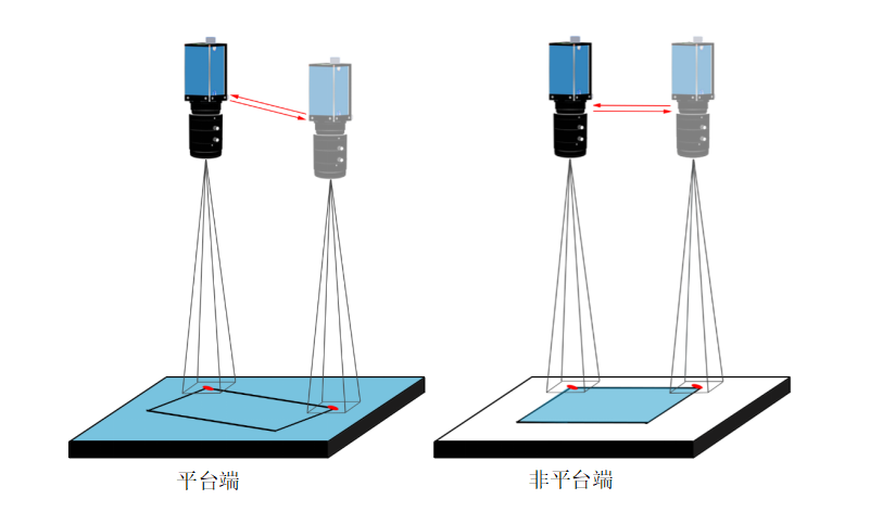 說明:平臺(tái)端和非平臺(tái)端來料位置都不固定,但是Mark與產(chǎn)品的相對(duì)位置固定。確保兩個(gè)Mark都在相機(jī)視野內(nèi)(通常是將產(chǎn)品抓起后再拍攝防止拍完再抓導(dǎo)致產(chǎn)品移動(dòng)或變形)。根據(jù)糾偏算法找到偏移量。根據(jù)偏移量和兩端相機(jī)的映射關(guān)系將平臺(tái)端的產(chǎn)品貼到非平臺(tái)端上。