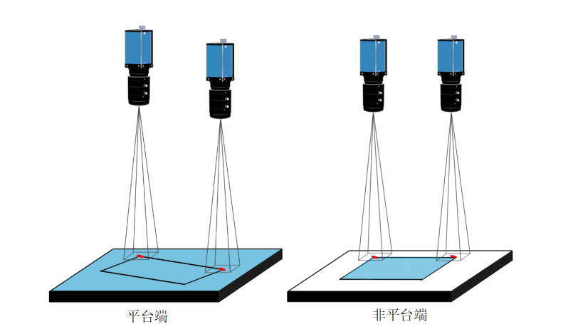 說明:平臺(tái)端和非平臺(tái)端來料位置都不固定,但是Mark與產(chǎn)品的相對(duì)位置固定。平臺(tái)端和非平臺(tái)端各有一個(gè)相機(jī),拍照并找兩張照片中Mark的角度坐標(biāo)差作為偏移量,根據(jù)偏移量和兩相機(jī)之間的映射關(guān)系,將平臺(tái)端的產(chǎn)品貼到非平臺(tái)端上。