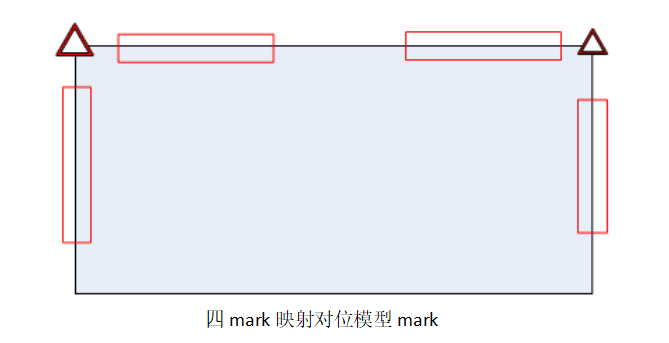 糾偏方法:如上圖所示,糾偏方法同雙Mark自對(duì)位,一般使用長(zhǎng)邊中點(diǎn)作為(x,y),長(zhǎng)邊角度作為θ。區(qū)別在于雙Mark自對(duì)位只有平臺(tái)端有相機(jī),通過平臺(tái)端的拍攝的Mark點(diǎn)和基準(zhǔn)Mark點(diǎn)對(duì)比;四Mark映射對(duì)位的平臺(tái)端和非平臺(tái)端都有相機(jī),通過平臺(tái)端拍攝的Mark點(diǎn)和非平臺(tái)端拍攝的Mark點(diǎn)對(duì)比。