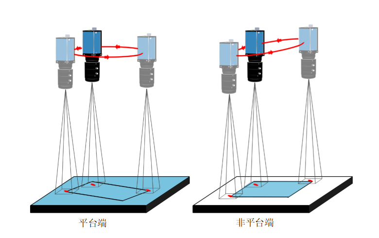 說明:六Mark映射對(duì)位有單相機(jī)和三相機(jī)兩種情況(平臺(tái)端)。單相機(jī)模型拍攝完一個(gè)Mark點(diǎn)后移動(dòng)位置拍攝另一個(gè)Mark點(diǎn),三相機(jī)模型三個(gè)相機(jī)分別拍攝三個(gè)Mark點(diǎn)。非平臺(tái)端與平臺(tái)端拍攝方式相同。得到Mark點(diǎn)后,根據(jù)糾偏算法找到偏移量,根據(jù)偏移量和兩組相機(jī)的映射關(guān)系將平臺(tái)端的產(chǎn)品貼到非平臺(tái)端上。