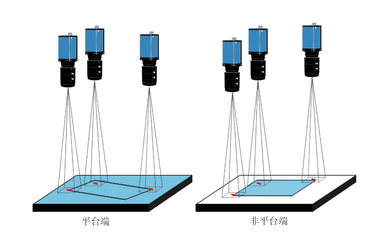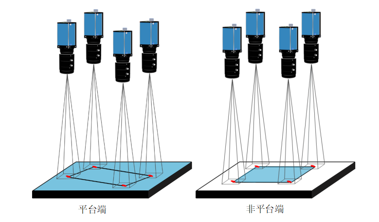說明:八Mark映射對(duì)位有單相機(jī)和四相機(jī)兩種情況(平臺(tái)端)。單相機(jī)模型拍攝完一個(gè)Mark點(diǎn)后移動(dòng)位置拍攝另一個(gè)Mark點(diǎn),四相機(jī)模型的四個(gè)相機(jī)分別拍攝四個(gè)交點(diǎn)。非平臺(tái)端和平臺(tái)端拍攝方法相同。找出兩端的Mark點(diǎn)后,根據(jù)糾偏算法找到偏移量,根據(jù)偏移量和兩組相機(jī)的映射關(guān)系將平臺(tái)端的產(chǎn)品貼到非平臺(tái)端上。