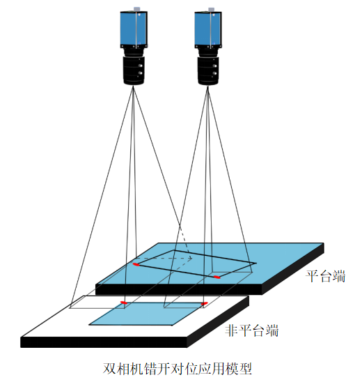 說(shuō)明:如上圖所示,以雙相機(jī)錯(cuò)開(kāi)對(duì)位模型為例。錯(cuò)開(kāi)對(duì)位模型近似于映射對(duì)位模型。相同點(diǎn)是平臺(tái)端和非平臺(tái)端的產(chǎn)品都是不固定的,區(qū)別是映射對(duì)位需要平臺(tái)端和非平臺(tái)端各有一組相機(jī),兩組相機(jī)通過(guò)映射關(guān)聯(lián)起來(lái),錯(cuò)開(kāi)對(duì)位模型中,每個(gè)相機(jī)都能同時(shí)拍攝到平臺(tái)端和非平臺(tái)端產(chǎn)品的相應(yīng)Mark點(diǎn)。得到Mark點(diǎn)后。根據(jù)糾偏算法找到偏移量,根據(jù)偏移量將平臺(tái)端的產(chǎn)品貼到非平臺(tái)端上。