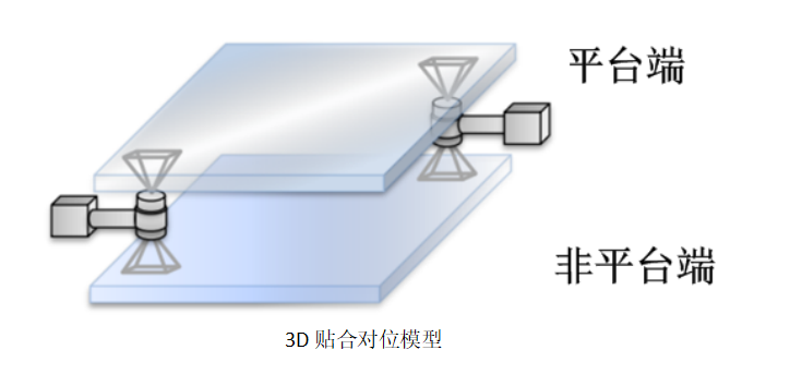 說(shuō)明:如上圖所示,3D貼合對(duì)位有幾種固定的抓Mark方法。上圖的所示方法與雙相機(jī)錯(cuò)開(kāi)對(duì)位相似。平臺(tái)端和非平臺(tái)端的產(chǎn)品都是不固定的,每個(gè)相機(jī)通過(guò)棱鏡鏡頭,能同時(shí)拍攝到平臺(tái)端和非平臺(tái)端產(chǎn)品的相應(yīng)Mark點(diǎn)。得到Mark點(diǎn)后。根據(jù)糾偏算法找到偏移量,根據(jù)偏移量將平臺(tái)端的產(chǎn)品貼到非平臺(tái)端上。