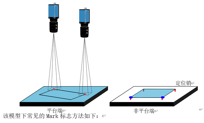 系統(tǒng)中可以使用兩個(gè),三個(gè)或四個(gè)相機(jī),每個(gè)相機(jī)都可以同時(shí)看到平臺(tái)端和非平臺(tái)端的對(duì)應(yīng)Mark點(diǎn)(可以通過(guò)移動(dòng)對(duì)位平臺(tái),使得Mark點(diǎn)之間有一定的間隔,可以避免Mark點(diǎn)之間干涉)。