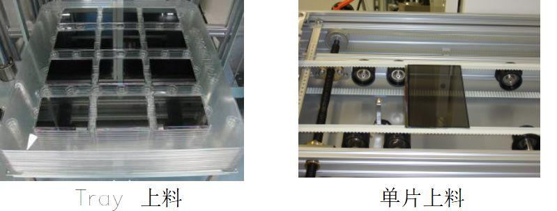 LCD loading有兩種結(jié)構(gòu),可利用Tray盤上料(適合較小尺寸),也可人工單片放在機器傳送帶上(大尺寸)。單片放置時須注意間隔不要太密,避免造成LCD電極劃傷。