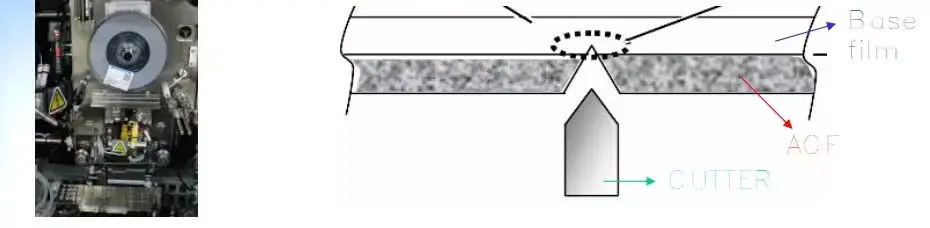 機器按照已設定長度,將ACF剪切后粘貼在LCD上。剪切方式為半切,過深或過淺都會造成ACF貼附問題。