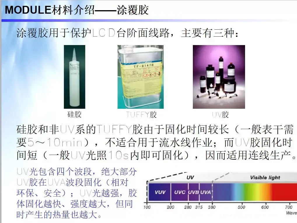 UV膠以紫外光固化,時間短、無污染、保護性佳、成本高。硅膠為RTV(室溫硬化)膠材,吸濕固化,時間長、成本低。TUFFY膠分為非溶劑系和溶劑系兩類。非溶劑系包括UV固化(同UV膠)和吸濕固化(同硅膠)兩種;溶劑系為揮發(fā)溶劑(乙醇)固化,時間稍長,成本中。天馬采用連線生產(chǎn)方式,要求作業(yè)時間短,現(xiàn)使用UV膠。